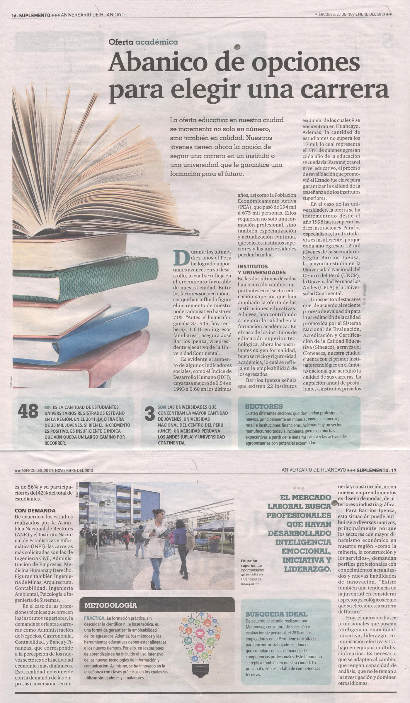 Por el aniversario de la ciudad de Huancayo, fui entrevistado por el diario El Comercio, sobre la educación superior en nuestra región. A continuación les presento la entrevista publicada el día 20 de noviembre en el suplemento de aniversario de Huancayo, primera publicación de este diario a nivel regional.
